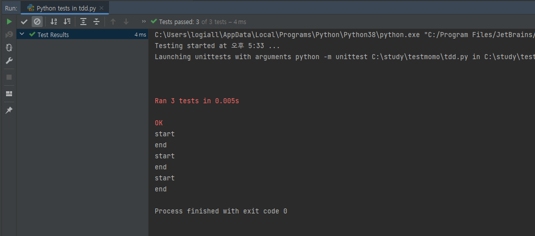 위의 코드를 실행하면 각각의 세 가지 메서드를 테스트 하기 전에 start를 출력하고 테스트 후에 end를 출력