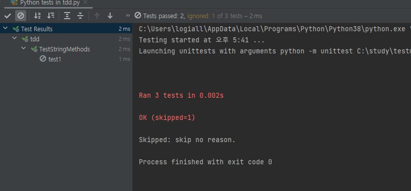 unittest의 skip decoration으로 해당 메서드 테스트를 스킵할 수 있다.